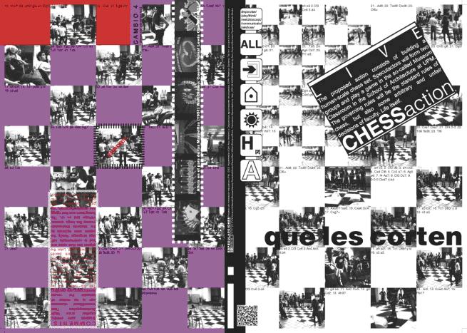 Esta acción improvisada trata de construir un tablero de ajedrez, elaborar las fichas y jugar una partida de ajedrez a escala natural en el aula Museo de la ETSAM entre dos equipos formados por todos los miembros de la clase, sometidos a las propias reglas conocidas del juego y a las decisiones arbitrarias e injustas del grupo docente: como la vida misma.