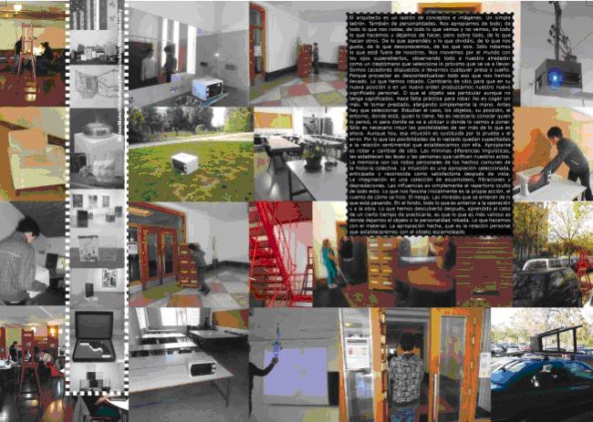 The proposed action consists of stealing five objects in the School of Architecture at UPM. Groups of three speculactors must steal five different things from an office, a crowded space, a silent space, a class session and an individual person. Each object will be photographed in a decontextualized setting and then returned to its original location. Every student must fulfill three functions: to keep watching, to steal something and to record the process.