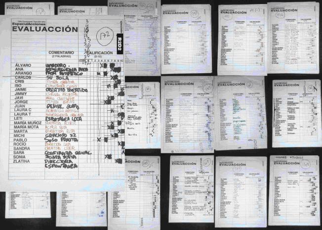 Esta acción trata de que cada alumno evalúe al resto de sus compañeros mediante la cumplimentación de un excel de multiplescuestiones que se rellenará durante dos horas en el que cada especulador se encuentra inmovilizado como pieza de belen navideño - según el personaje escogido - ubicado en el hall principal de la escuela, disfrazado con las piezas generadas por ellos mismos en su labor continua de punto desarrollada a partir de aburridizacción.