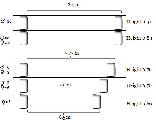c. Hurdles race. Hurdle two hurdles within three steps, at full speed, with a wind up before. The minimum performance height and length between the men’s hurdles are 0,76 metres height and 7,00 metres length. Among girls the hurdles will be set at 0,60 metres, with a separation of 6,50 metres. Any student who does not perform the test on these minimums will be automatically failed. There will be progressive increases on the difficulty to establish the starting mark that the student can reach on the assessment test (see picture below).